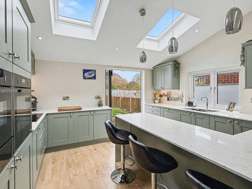 The modern kitchen is open to the living room, so it’s a proper sociable space- cook, chat, friends perched at the counter. Both bedrooms are a great size (no awkward box room), and the bathroom’s fresh and modern.